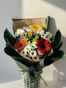 Состав букета : Гербера , альстромерия , хризантема , гипсофила . В составе имеются сезонные цветы которые подлежат замене , по усмотрению флориста с сохранением цветовой гаммы .