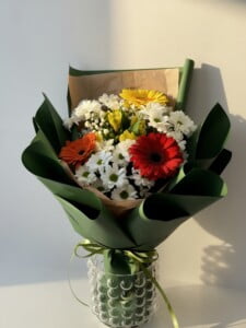 Состав букета : Гербера , альстромерия , хризантема , гипсофила . В составе имеются сезонные цветы которые подлежат замене , по усмотрению флориста с сохранением цветовой гаммы .